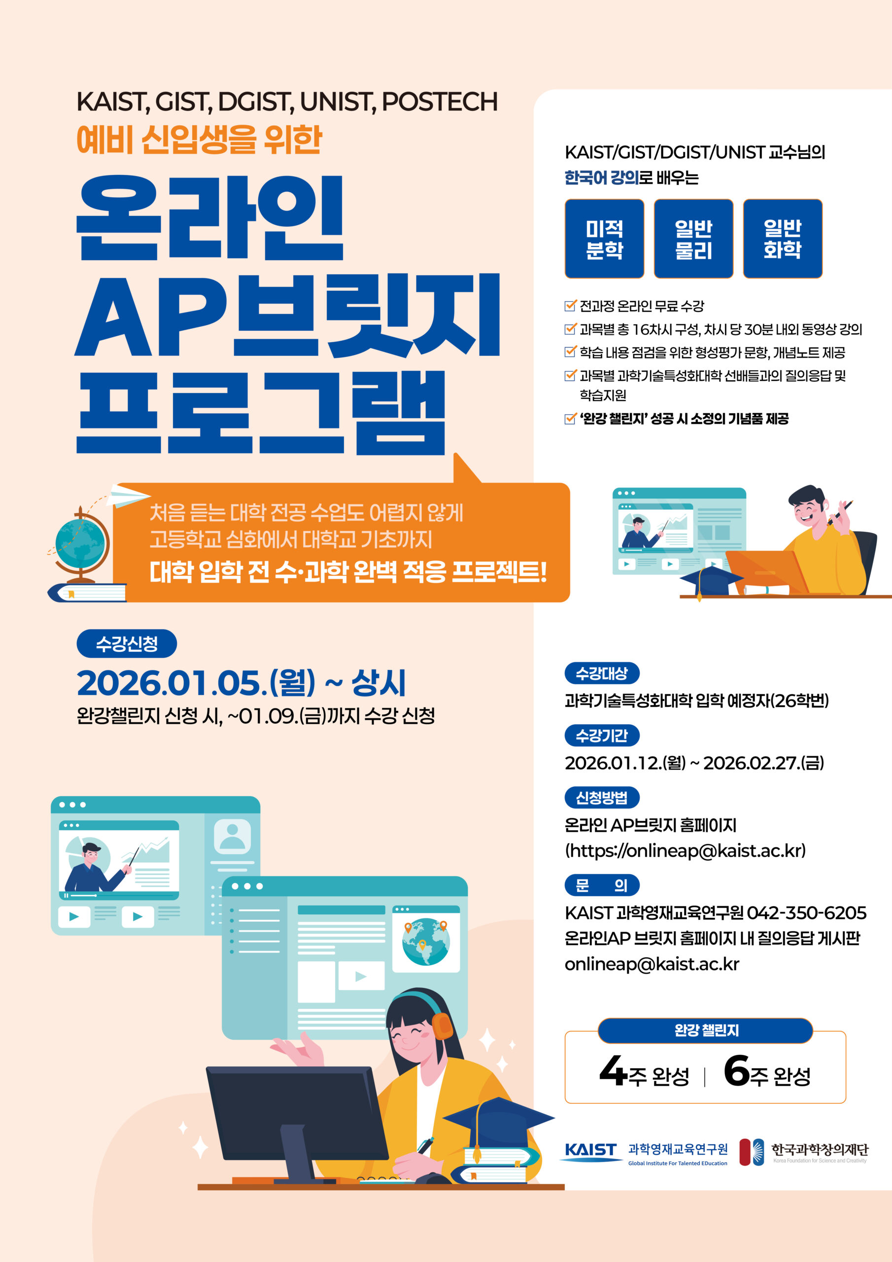 2025. 12. 10 2026 온라인 AP 브릿지 프로그램 안내 라인 AP 브릿지 프로그램은 AP 과목 수강 경험이 없는 과학기술특성화대학 입학 예정 학생들이 대학 수업에 적응할 수 있도록 도움을 주기 위한 목적의 수학·과학 온라인 교육프로그램입니다. 고등학교 심화 과정 및 대학 기초과정을 포함하는 과목(미적분학, 일반물리, 일반화학)을 무료로 제공합니다. 온라인 AP 프로그램 이수를 통한 학점 취득은 불가능하지만,…